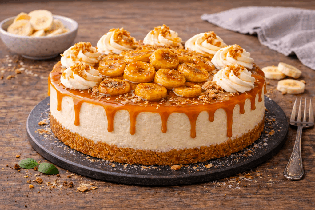Krémový pečený cheesecake s banánovou náplní a vrchní vrstvou karamelizovaných banánů – dekadentní dezert s intenzivní chutí inspirovaný banoffee pie.