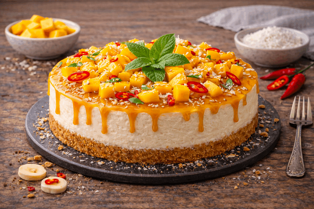 Exotický nepečený cheesecake s mangem, kokosem a jemným dotekem chilli – tropická fusion, která kombinuje sladké, krémové a pikantní tóny.