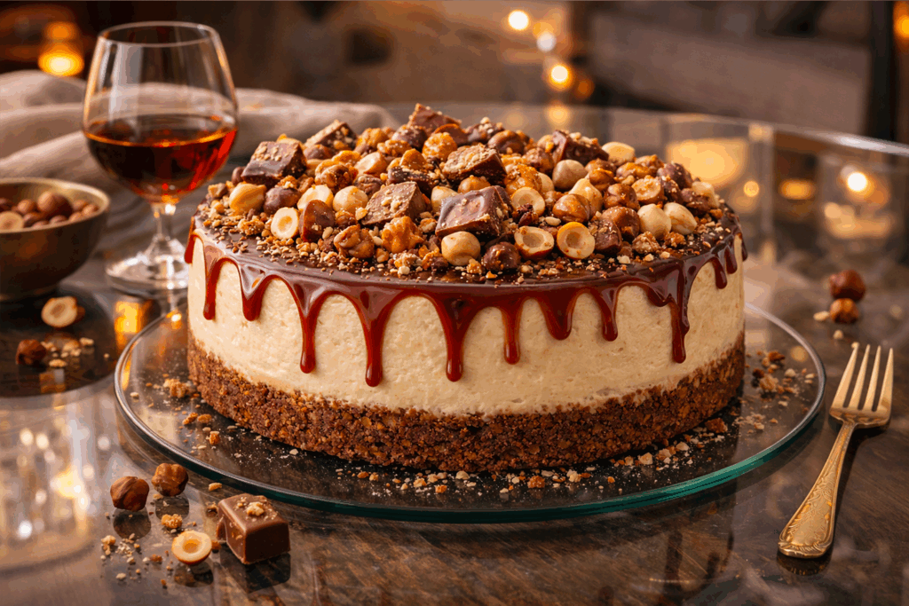 Nepečený cheesecake s domácím nugátem a lískovými oříšky – luxusní dezert s intenzivní oříškovou chutí připomínající italskou gianduju nebo pralinky.