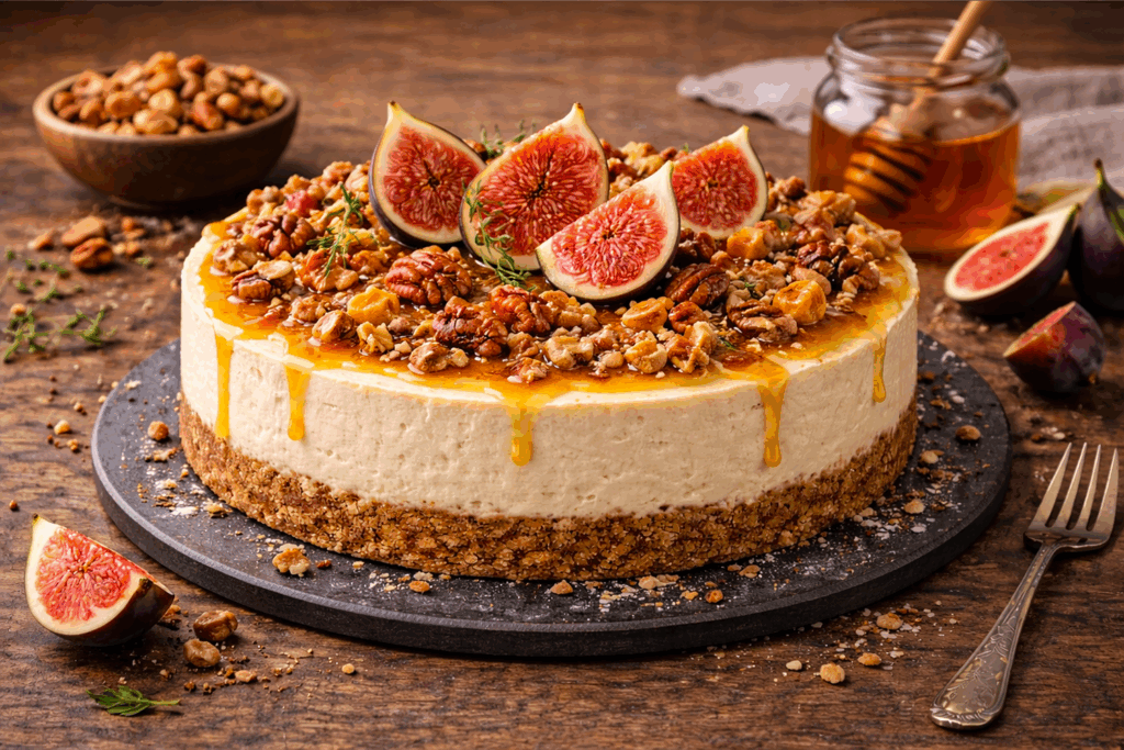 Pečený cheesecake s vlašskými ořechy, medem a čerstvými fíky – podzimní dezert s rustikální chutí a texturou, inspirovaný středomořskou kuchyní.