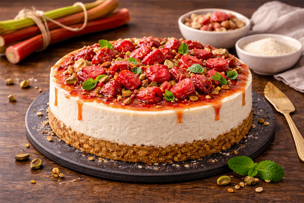 Klasický pečený tvarohový cheesecake s kyselou rebarborou – tradiční česká kombinace chutí v moderní podobě, ideální pro jarní a rané