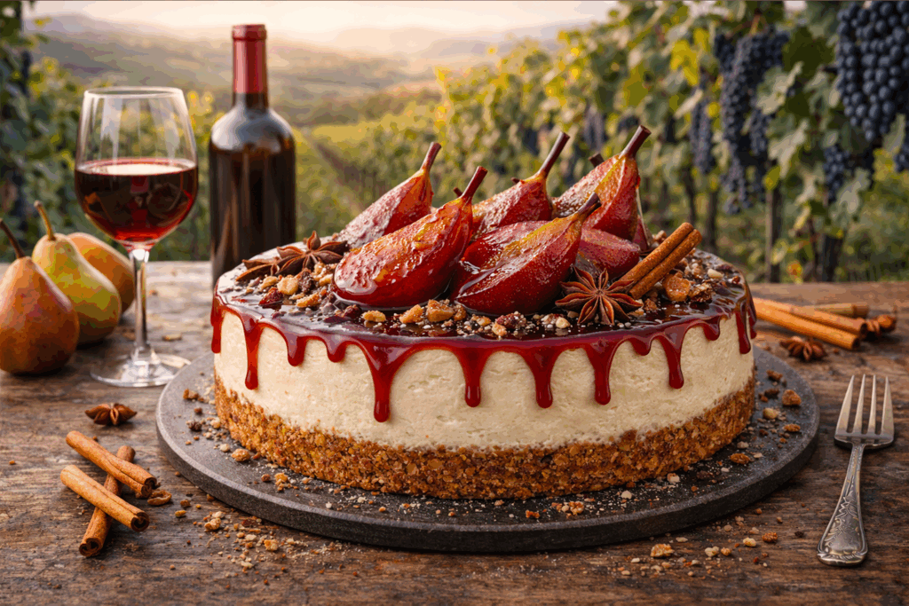 Sofistikovaný pečený cheesecake s červeným vínem, hřejivým kořením a hruškami v červeném víně – elegantní podzimní dezert ideální k večeři