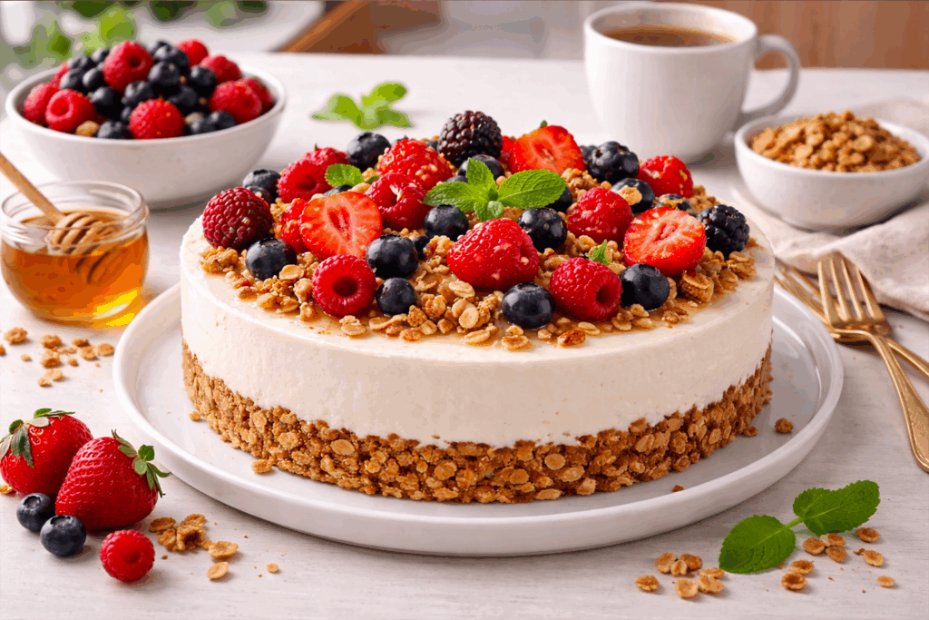 Lehký nepečený cheesecake s řeckým jogurtem, granolou místo korpusu a čerstvými lesními plody – zdravější varianta připomínající snídaňový parfait. Recept