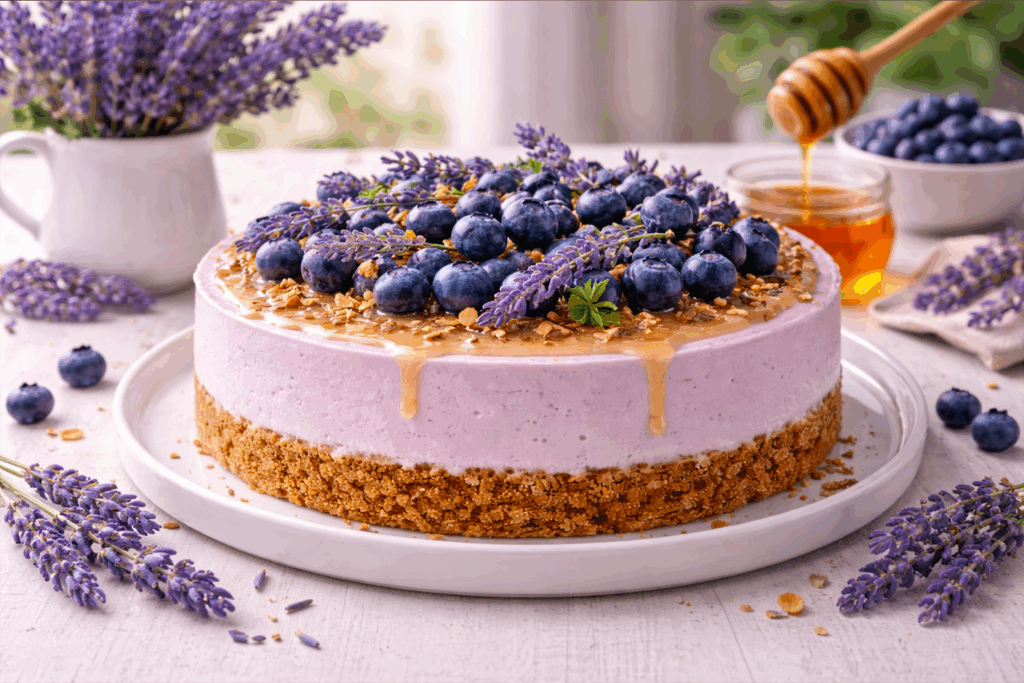 Sofistikovaný nepečený cheesecake s jemnou levandulí, medem a borůvkami – elegantní letní dezert s květinovou aromatikou a provensálským nádechem. Recept