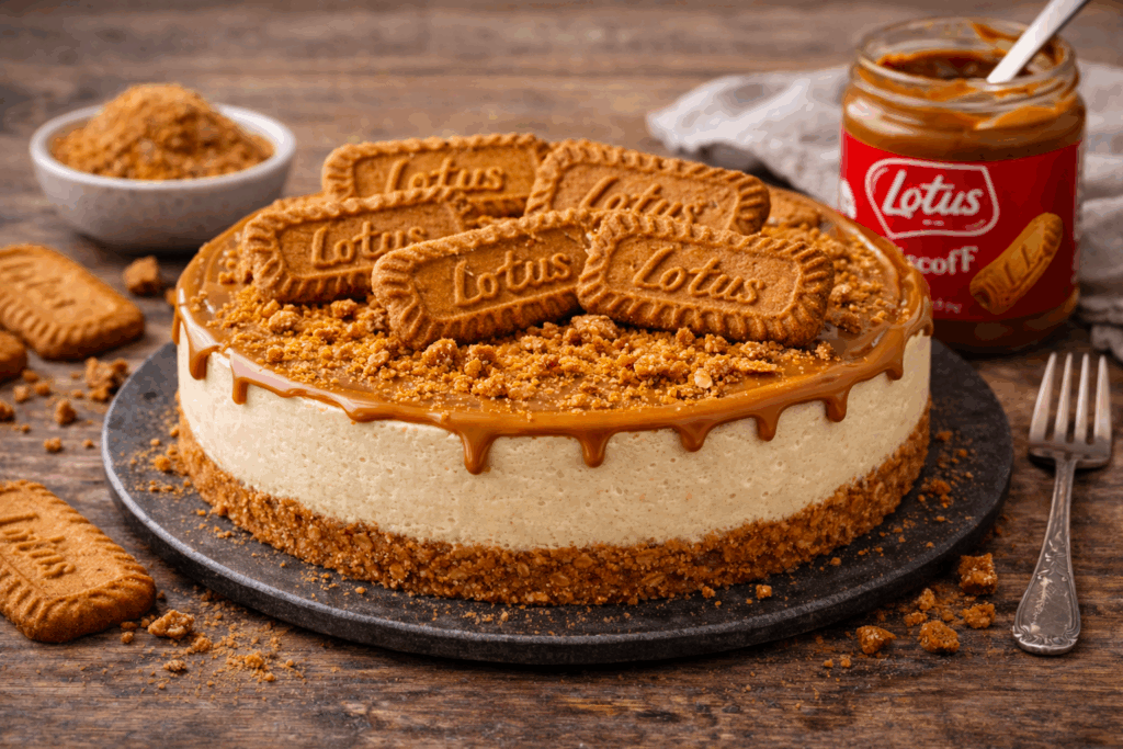 Nepečený cheesecake s karamelovou Lotus Biscoff pomazánkou – trendy dezert se spekuláskovou chutí a bohatou hnědozlatou barvou. Lotus Biscoff je