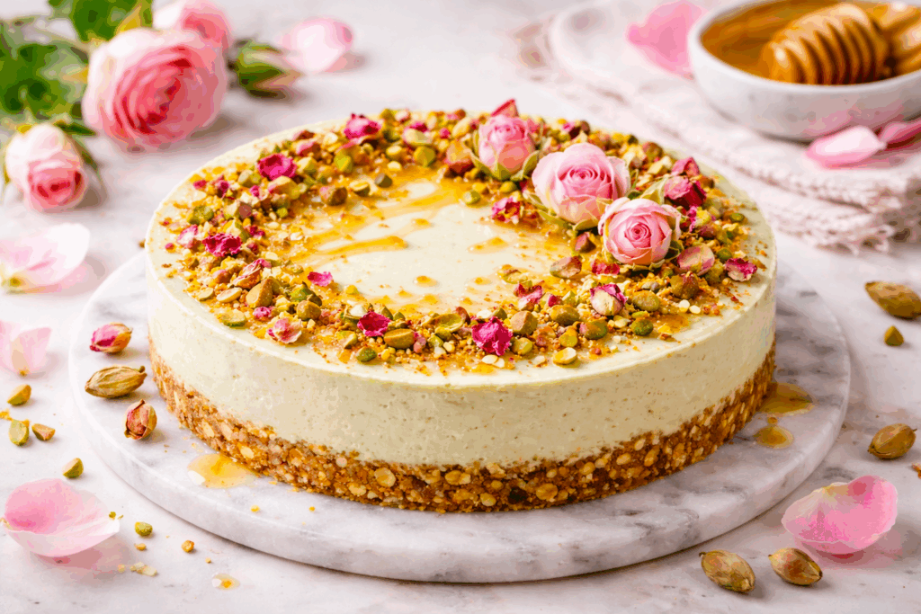 Elegantní nepečený cheesecake inspirovaný blízkovýchodní kuchyní – pistácie, růžová voda a med vytvářejí sofistikovaný dezert se zeleno-růžovou barevností. Pistácie jsou