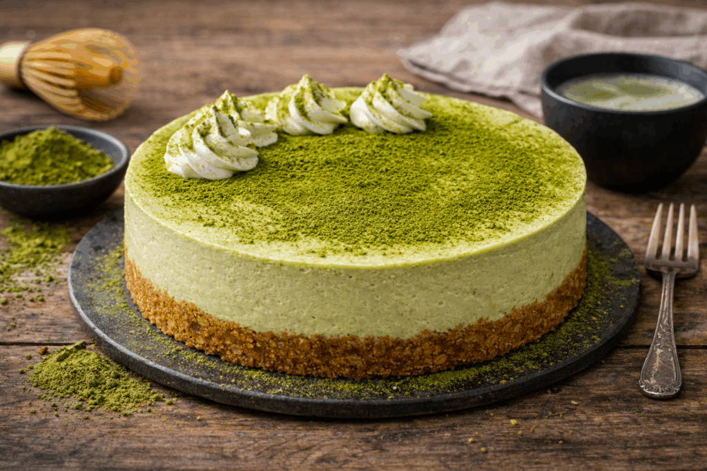 Sofistikovaný cheesecake s japonským zeleným čajem matcha – zemitá, lehce hořká chuť a výrazná zelená barva bohatá na antioxidanty. Matcha