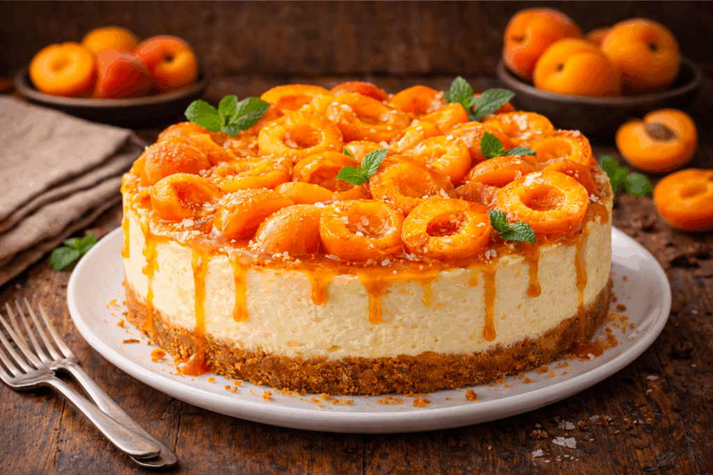 Klasická česká chuťová kombinace tvarohu a meruněk v podobě cheesecaku – sezónní letní dezert plný slunečné chuti. Perfektní pro letní